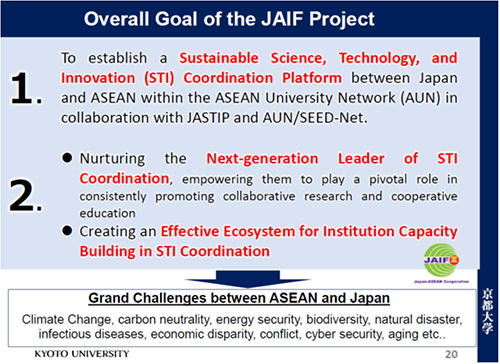 In light of this situation, we have begun to build a sustainable ASEAN-Japan STI collaboration platform led by the ASEAN University Network (AUN) in collaboration with the Japan-ASEAN Science, Technology and Innovation Platform (JASTIP), Kyoto University, and AUN/SEED-Net under the support of the Japan-ASEAN Integration Fund (JAIF) to foster the next generation of STI leaders in STI Coordination by empowering them to play a crucial role in consistently promoting collaborative research and cooperative education between ASEAN and Japan. Additionally, we aim to create an effective ecosystem for institutional capacity building in STI.