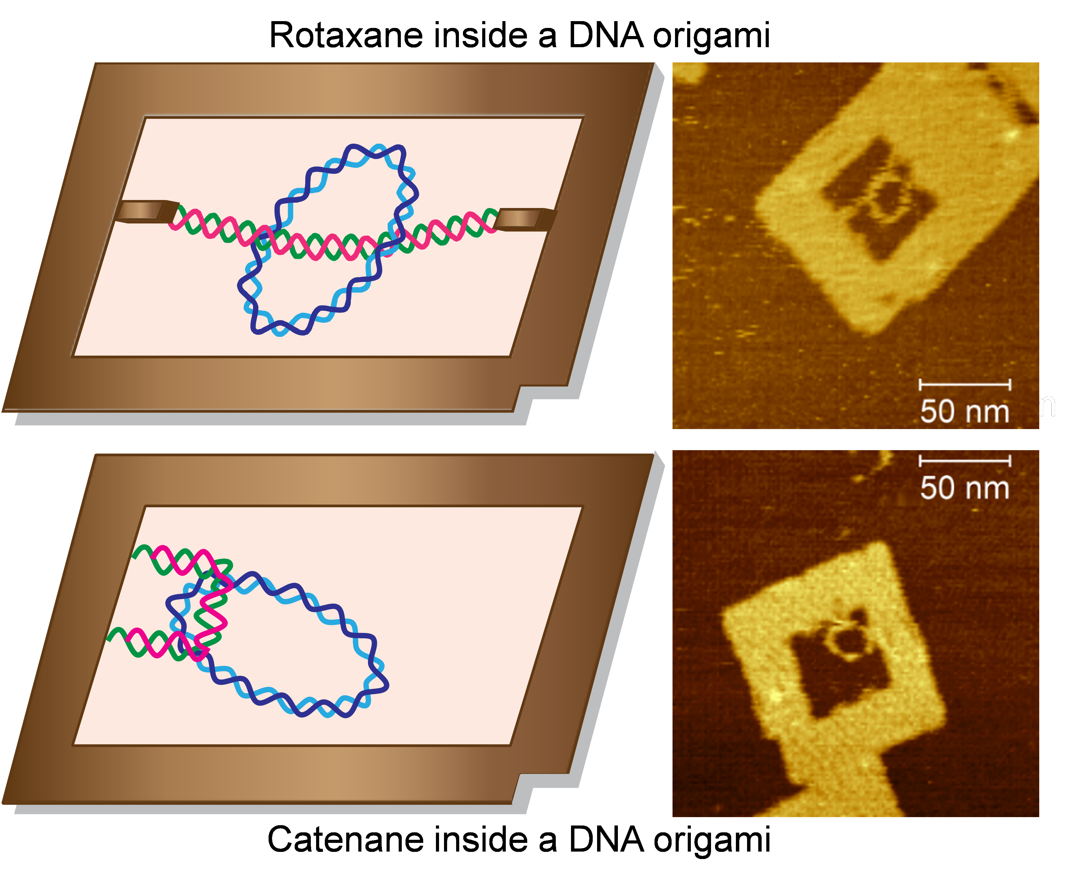 DNA rotaxane and catenane inside a DNA origami frame Left: The illustration of the topologically interlocked DNA rotaxane and catenane inside a DNA origami frame. Right: AFM images of the respective structures