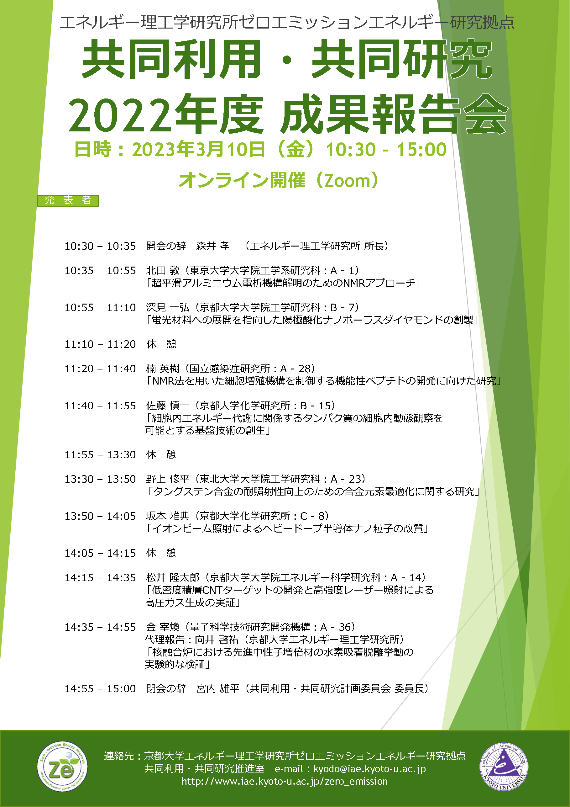 In this meeting, we will report on the results of the fiscal year 2022 of the open-call joint usage and joint research, which is one of the important activities of the institute, and deepen the discussion on zero-emission energy.
